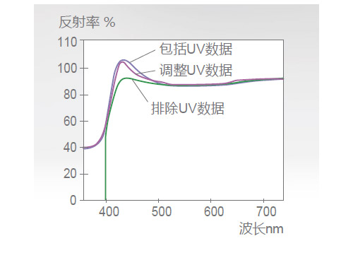 想要准确测量用荧光增白剂(FWA)处理过的纸或布等材料,需要精确控制UV含量及其影响。CM-36dG和CM-36dGV所用的数字UV控制方式能够通过合适的计算将两种氙灯(一种具有完整的UV能量,另一种具有通过400 nm或420 nm UV截止滤光片去除UV能量)的闪光结果结合起来进行控制。此种方法无需进行机械的滤光定位,通过白度指数、色调、亮度或UV配置等进行UV调整。